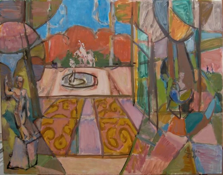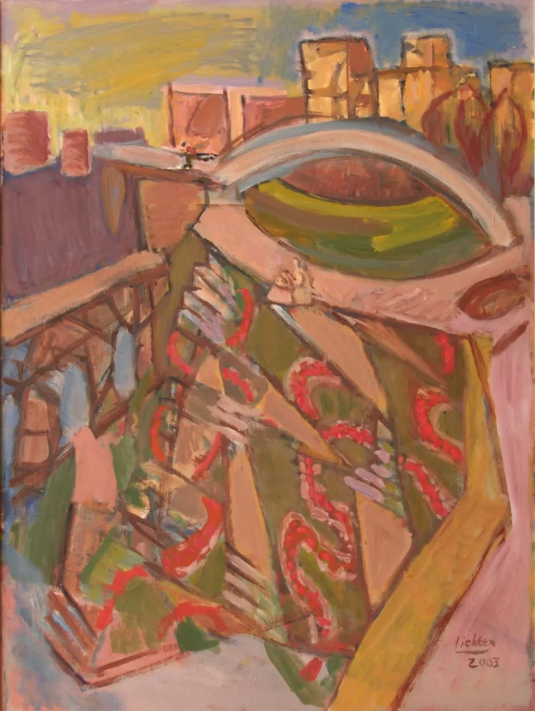 Albert Lichten – Lecture au square Séverine à Paris – 2001 – huile/toile – 73 x54 cm Le promeneur grimpe les marches de l’escalier ;